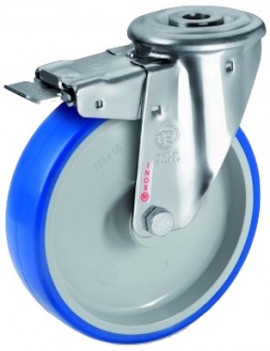 Roulette INOX diamètre 125 mm pivotante frein à Oeil polyuréthane BLEU-SOFT® - 180 Kg
