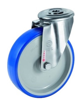 Roulette INOX diamètre 125 mm pivotante à Oeil polyuréthane BLEU-SOFT® - 180 Kg