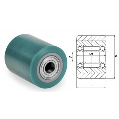 GALET DE TRANSPALETTE POLYURÉTHANE VERT 75° SHORE A , CORPS ACIER