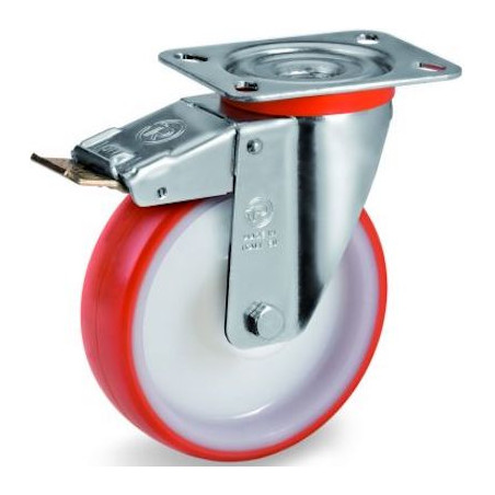 Roulette diamètre 200 mm pivotante à frein polyuréthane rouge - 300 Kg